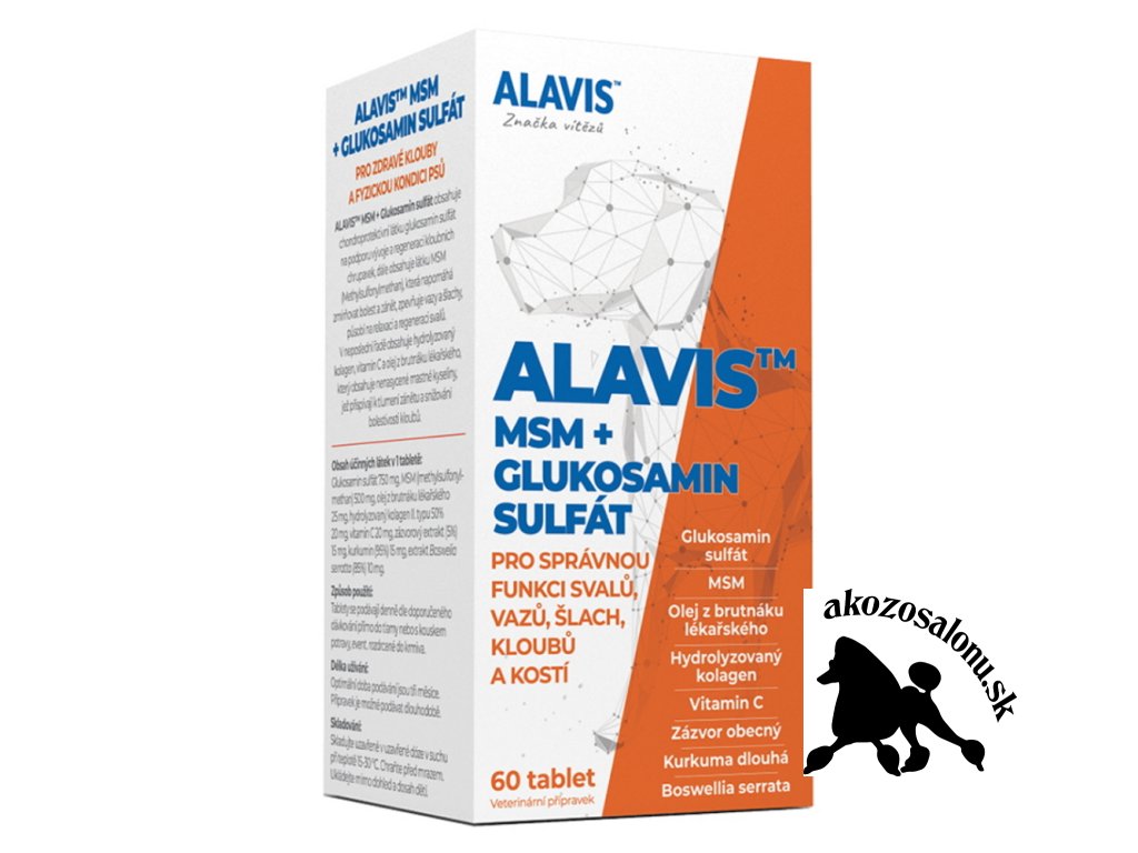 ALAVIS™ MSM + Glukosamin sulfát je osvedčenou kombináciou látky MSM a Glukosamin sulfátu pre správnu funkciu väzov, šliach, kĺbov a kostí. Odporúča sa najmä u šteniat a mladých psov pre správny vývoj pohybového aparátu a u psov každého věku pri ochoreniach kĺbov, kostí a svalových úponov a pre ich prevenciu. Jedinečná kompozícia tohto prípravku spôsobuje výrazný účinek proti bolesti a zápalu.