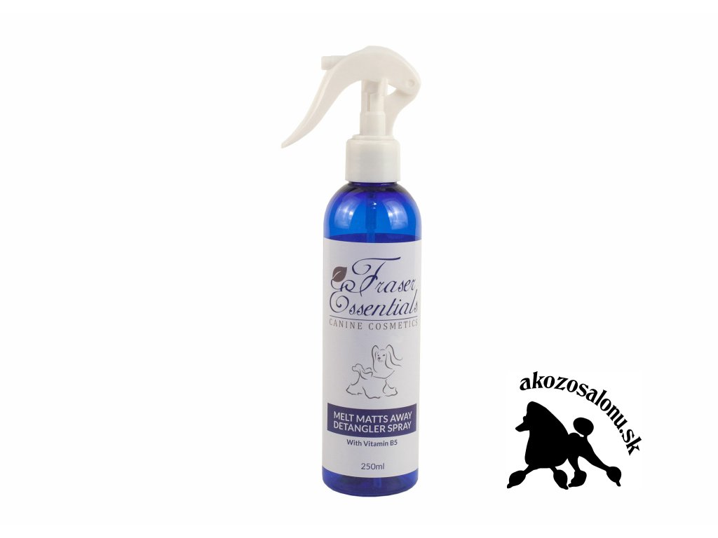 Riešite splsenú srsť pred jej úpravou a strihaním? Sprej Fraser Essentials Melt Matts Away zmäkčuje už vytvorenú plsť pred česaním a uľahčuje jej rozčesávanie. Obohatený o vitamín B5 pre hydratáciu a posilnenie srsti, zabraňuje jej budúcemu plstnateniu. Bez parabénov, farbív a vôní, je bezpečný na každodenné použitie.