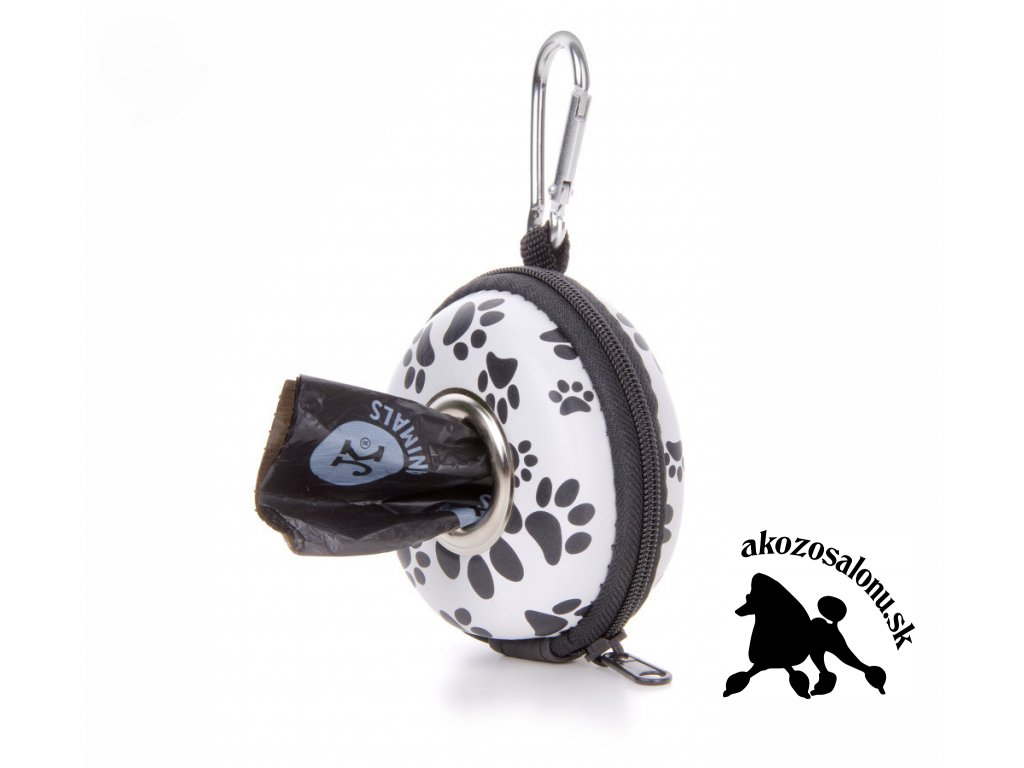 Okrúhle plastové puzdro so zipsom a kovovou karabínou slúži ako zásobník na sáčky pre psie exkrementy. Vďaka karabíne si môžete puzdro pripnúť k rifliam, taške alebo batohu a mať ich tak neustále po ruke. Puzdro má vnútri kapsičku na drobné veci (ako kľúč a podobne).